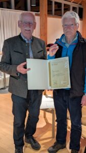 Bernhard Zenger erhält vom Vorsitzenden des Kreisverbands, Herrn Schäfers, die Ehrennadel in Gold mit Lorbeerkranz am Band für 60 Jahre Mitgliedschaft.